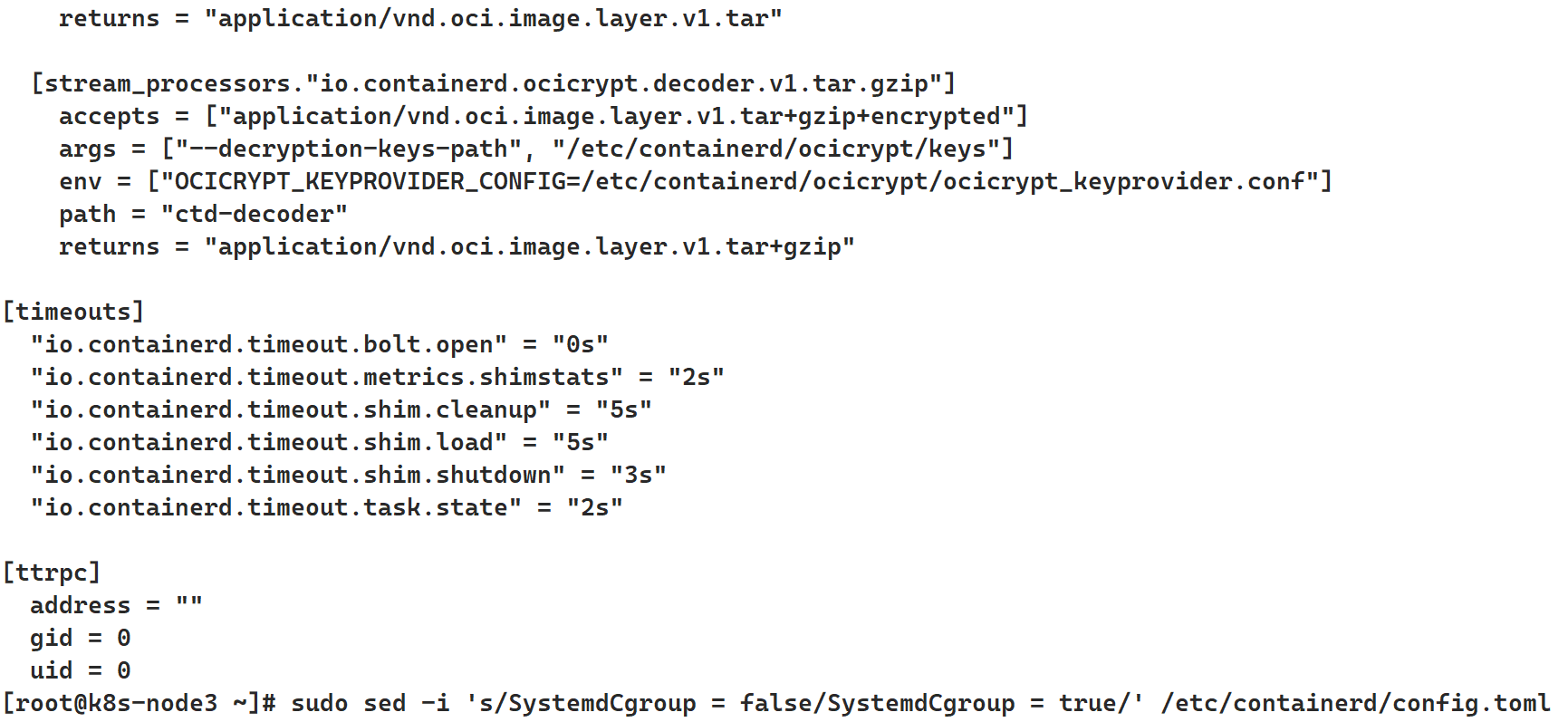 sudo sed -i 's/SystemdCgroup = false/SystemdCgroup = true/' /etc/containerd/config.toml