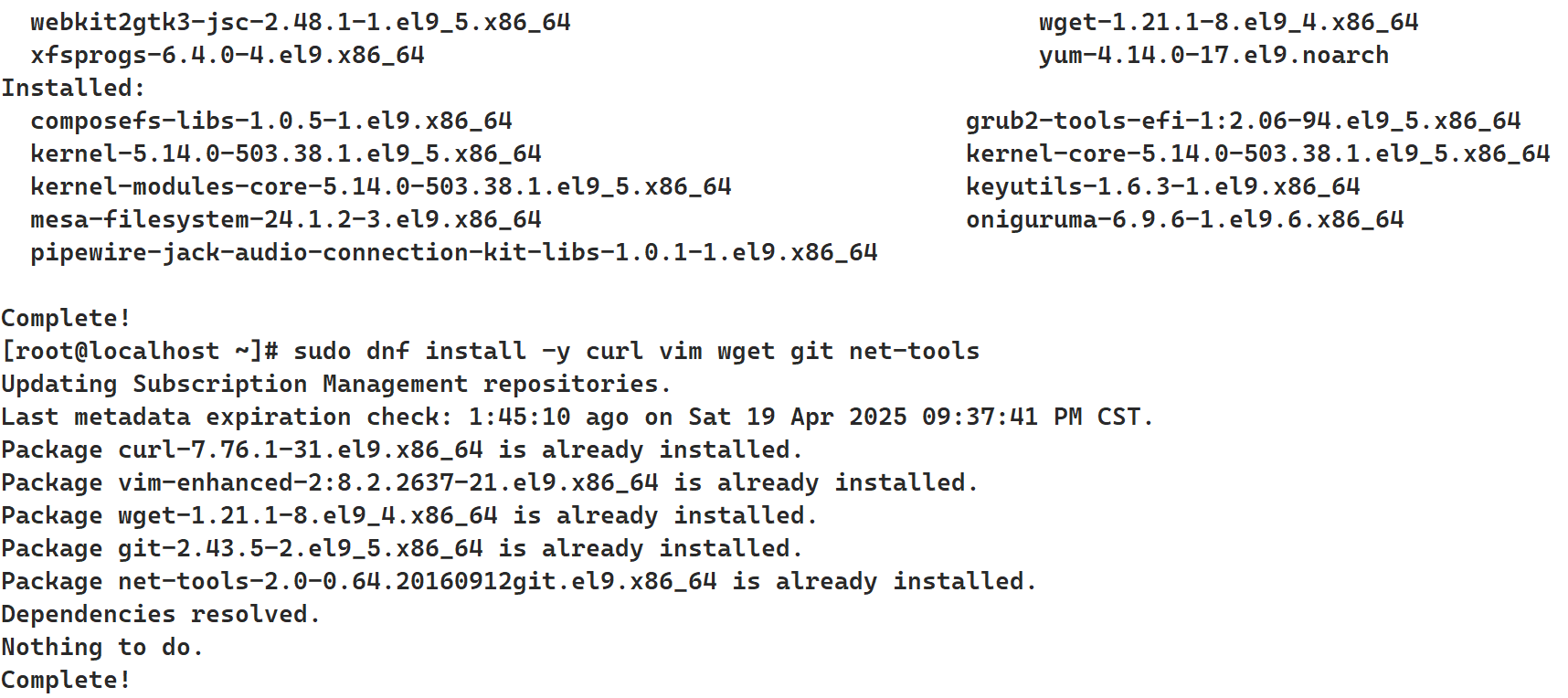 sudo dnf install -y curl vim wget git net-tools如下图,
