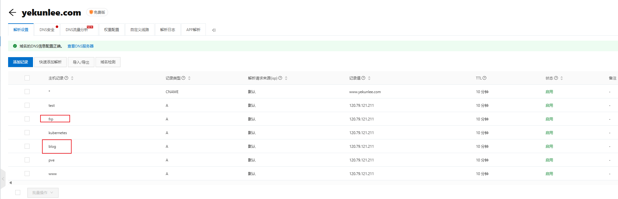 在阿里云平台添加域名主机记录,比如作者的博客域名blog.yekunlee.com,frp的web域名frp.yekunlee.com