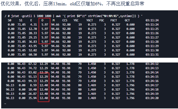如下图,使用jstat -gcutil 1 1000 1000命令观察内存gc情况,每秒采样一个点