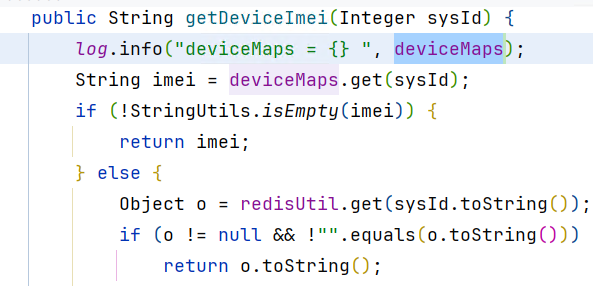 从业务上看,这一段代码是想通过设备上送的sysid查询设备的token在内存中是否存在,如果存在则通过sysid返回IMEI,仅仅只是为了获取单个设备的IMEI号,没必要打印整个map对象。