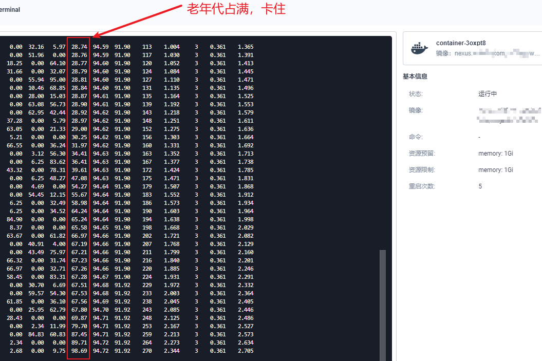 明显看到Old区很快(几十秒内)达到100%,右侧docker容器也显示重启次数5次
