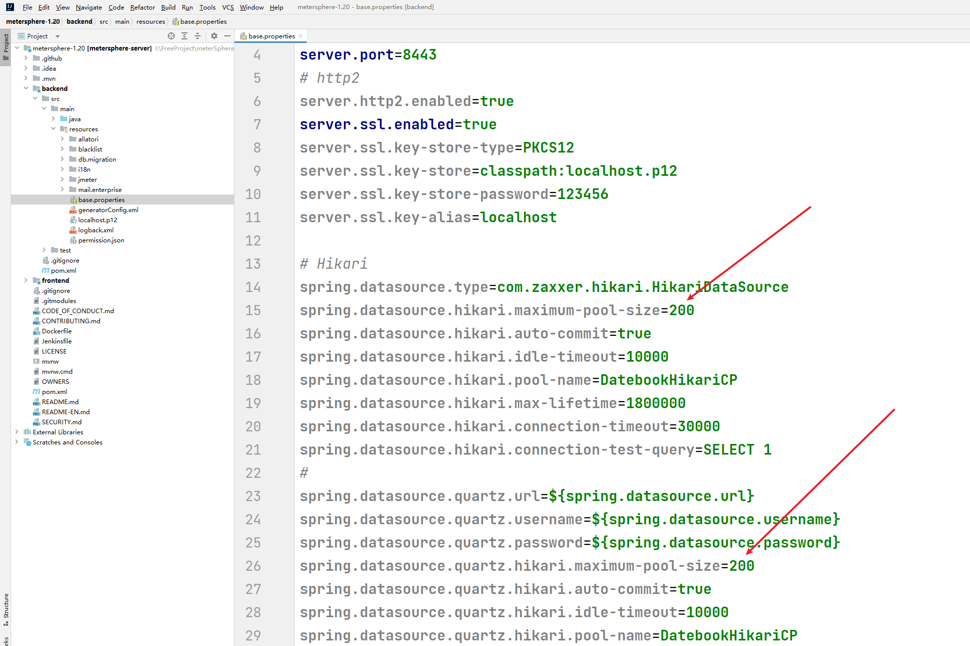如下图,打开源码,查看properties文件中的数据库连接池配置,明显太大了