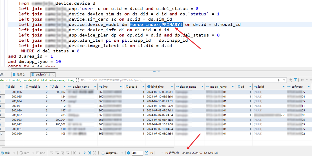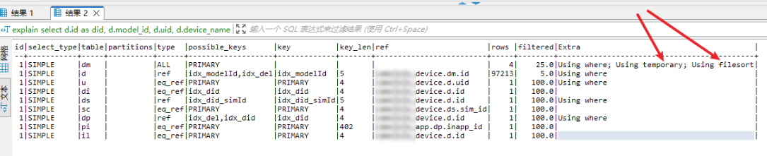 观察SQL语句,查询条件left join device.device_model dm on dm.id = d.model_id中用到dm的仅dm.id,possible_keys也显示了primary,但是执行计划未走primary主键索引,而是all全表扫