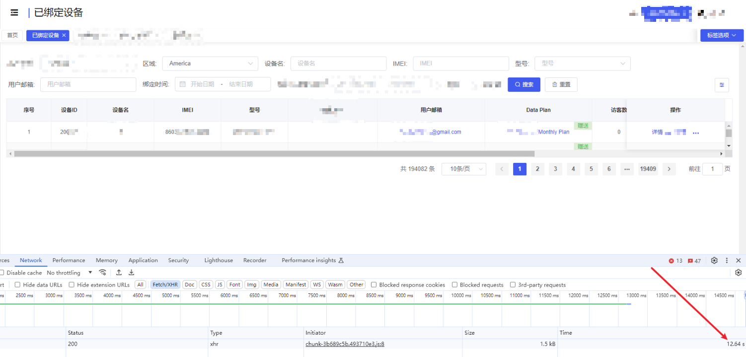 如下图,某个IoT系统的后台管理页面,查询已绑定的设备列表,20万设备量级,耗时12.64s